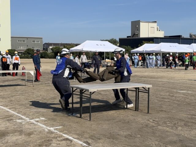「一般消火の部」では、119番通報後に競技を開始し、消火器・水バケツを用いて消火の正確さと速さを競いました。「危険物施設の部」は、消火作業に加えて負傷者(訓練用人形)の搬送も行うなどより実践的な競技内容でした。