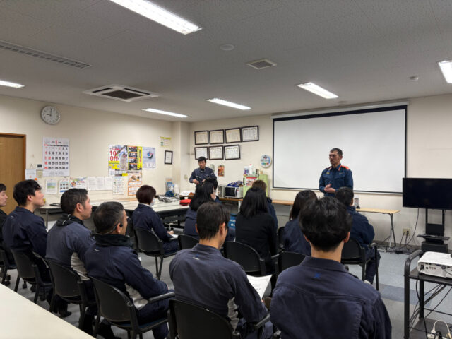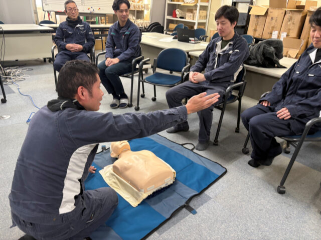 この講習会には、福山地区消防組合水上消防署より救急隊員2名を講師としてお招きし、従業員14名が参加しました。